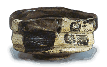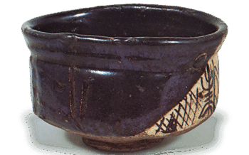 日本 黒織部 杉文 沓茶碗 黒織部 杉文 沓茶碗Black Oribe 'Shoe'-shaped tea bowl -with design of sugi (Japanese cedar) trees. Kuro-Oribe... 2014.06.24 日本日本の陶滋織部茶碗